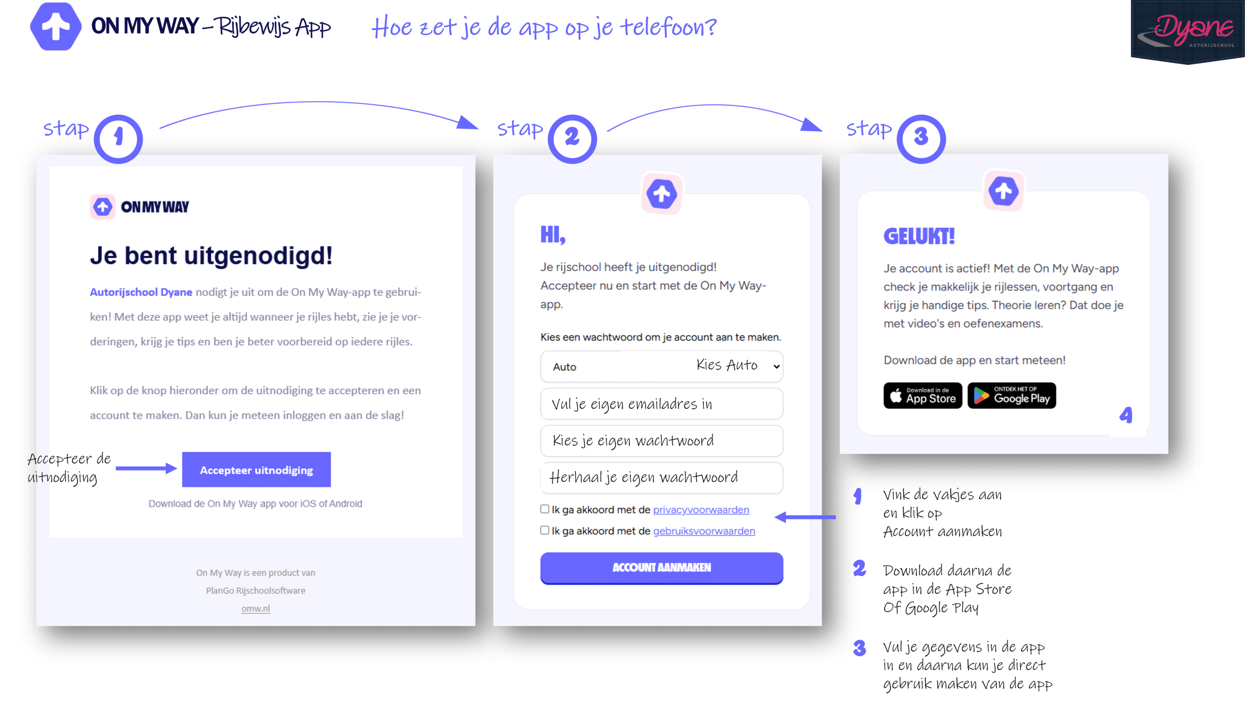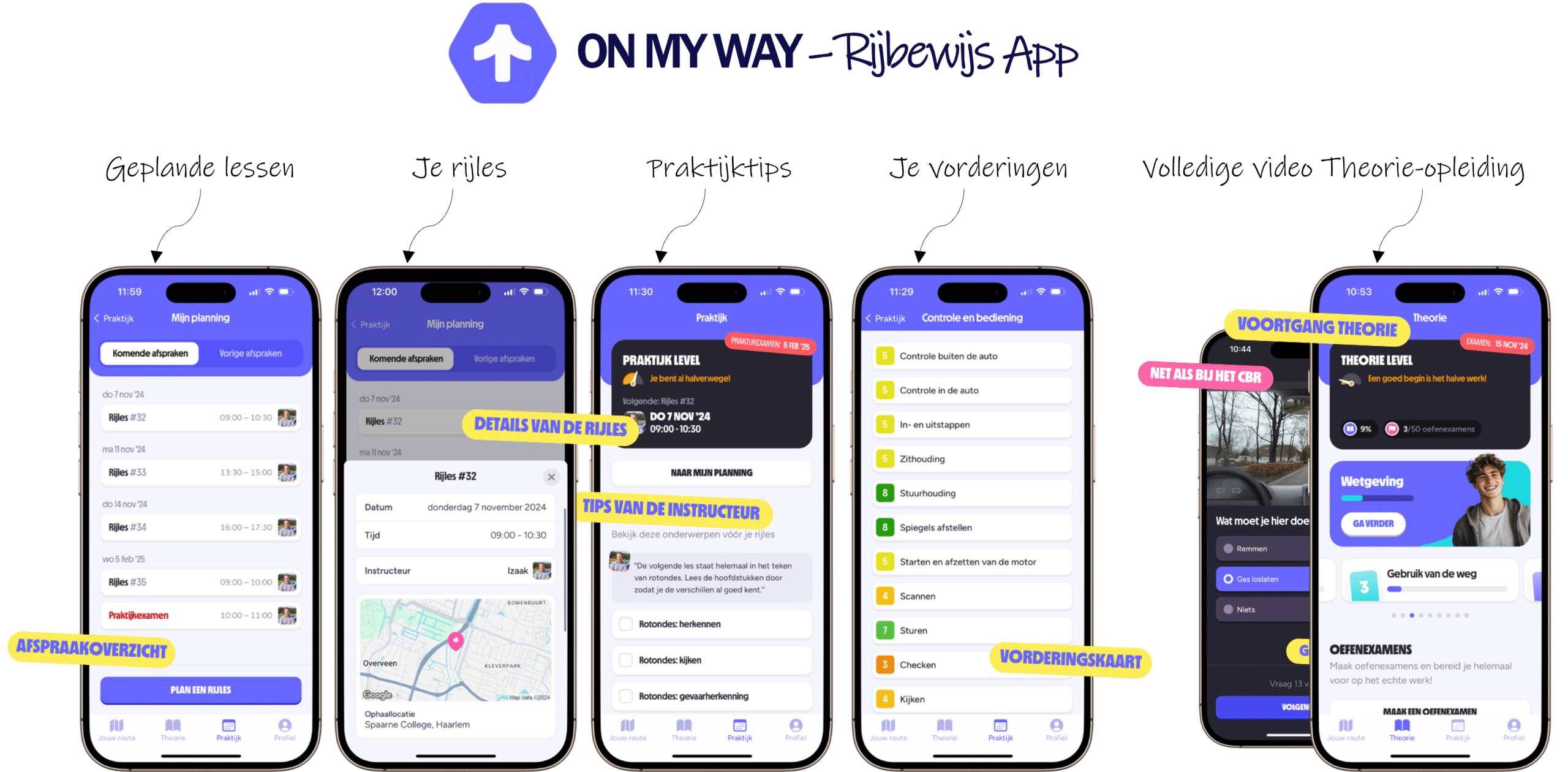 Binnen mijn autorijschool maak ik voor de leerlingenadministratie gebruikt van de software van PlanGo. Bij de start van je rijopleiding ontvang je van mij de inloggegevens voor de gratis On My Way-app. Via de app kun je je facturen, je lestegoed en je vorderingen op je leskaart inzien. Voor iedere ingeplande rijles ontvang je een afspraakbevestiging. En voor alle zekerheid stuur ik je de avond voor je volgende les nog een herinnering. Dus de gratis On My Way-app kun je eigenlijk niet missen tijdens je rijopleiding.
